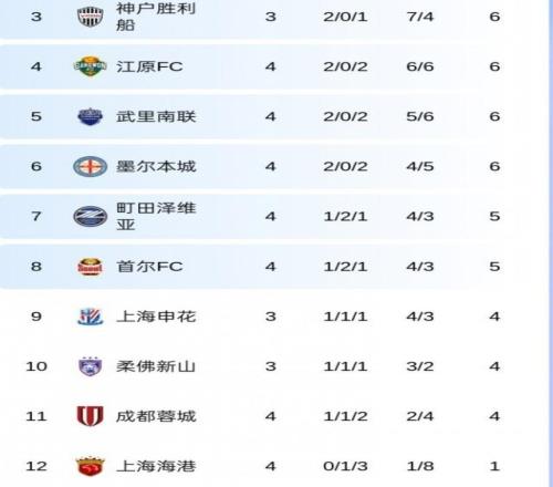 亚冠精英联赛东亚区积分榜,上海海港队4战后暂时垫底。
